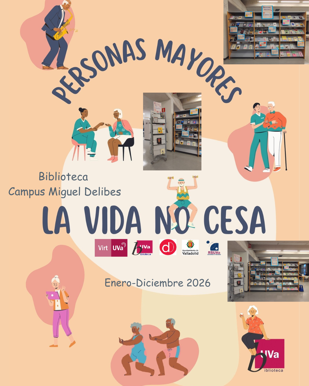 La Biblioteca del Campus Miguel Delibes y el Proyecto de Innovación Docente #SYMBOLON “El poder de las redes intergeneracionales en la construcción de comunidades más justas e inclusivas” han unido sus fuerzas para organizar la EXPOSICIÓN “Personas mayores, la vida no cesa”, instalada en las dependencias de la Biblioteca durante el año 2026.